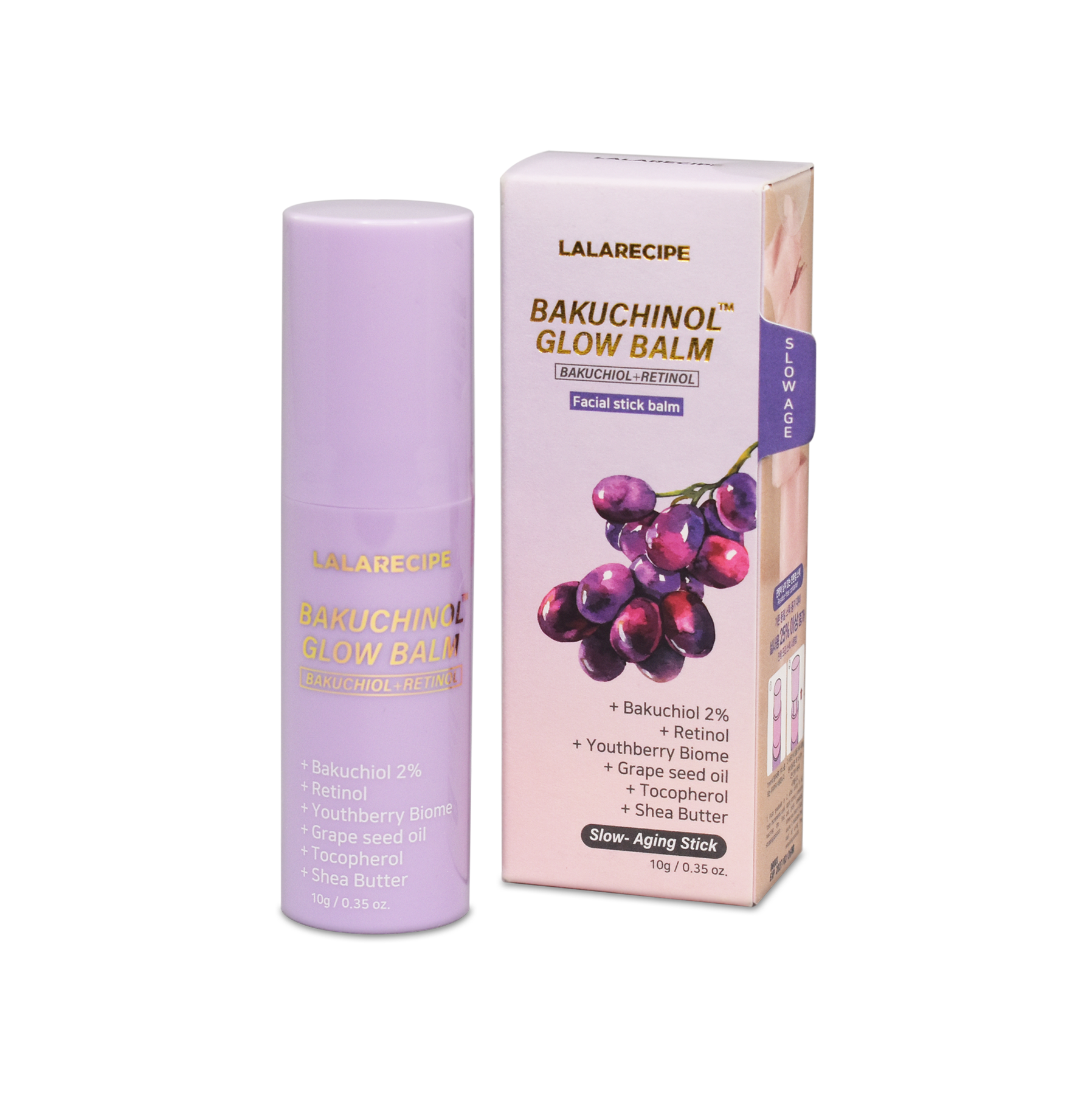 Multi-balsamo viso in stick bifunzionale per schiarire la pelle e attenuare le rughe. Contiene Bakuchinol™ (ingrediente brevettato da LALARECIPE), burro di karitè e bioma della bacca di gioventù, per migliorare elasticità e rimodellamento delle guance.